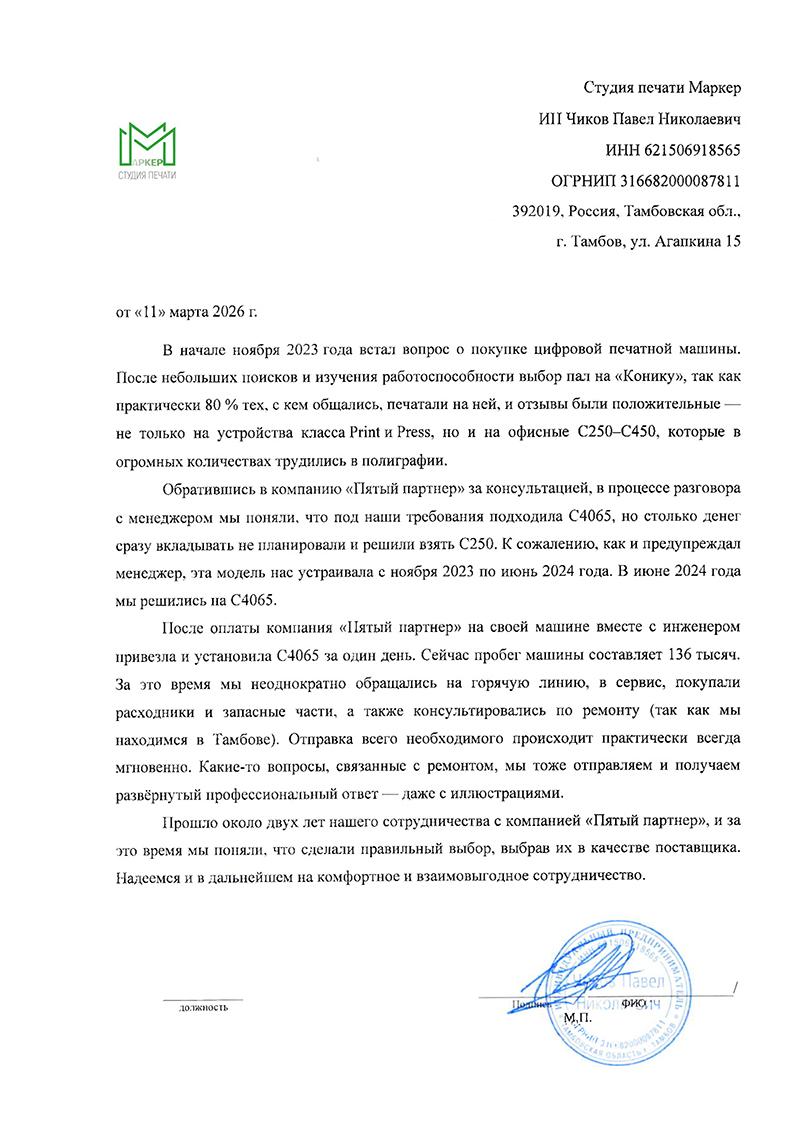 Хочется выразить благодарность компании «Пятый партнер» за поставку и дальнейший запуск оборудования «AccurioPrint С4065» в город Луганск. Оборудование было запущено в январе 2025 года и по сегодняшний день его работа не вызывает нареканий. Не смотря на удаленность сервисного центра, вопросы, которые возникали в процессе работы, решались достаточно оперативно благодаря горячей линии.