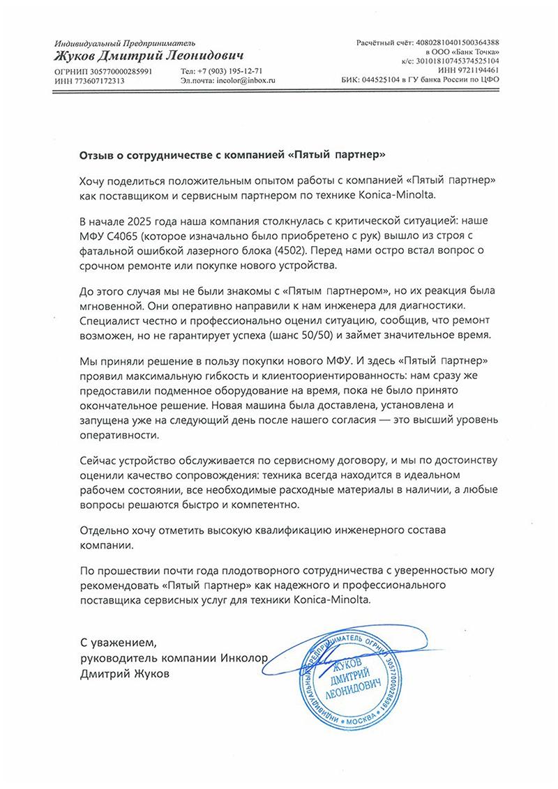 По прошествии почти года плодотворного сотрудничества с уверенностью могу рекомендовать «Пятый партнер» как надёжного и профессионального поставщика сервисных услуг для техники Konica-Minolta.