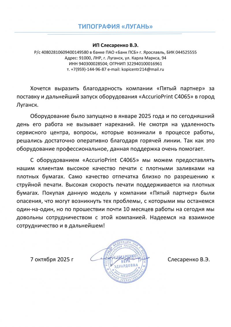 Хочется выразить благодарность компании «Пятый партнер» за поставку и дальнейший запуск оборудования «AccurioPrint С4065» в город Луганск. Оборудование было запущено в январе 2025 года и по сегодняшний день его работа не вызывает нареканий. Не смотря на удаленность сервисного центра, вопросы, которые возникали в процессе работы, решались достаточно оперативно благодаря горячей линии.